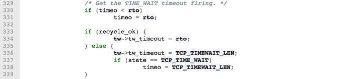 前面提到过一个不严谨的表述:“如果TCP内核参数tcp_tw_recycle和tcp_timestamps同时为1,正常情况下处于TIME_WAIT状态的socket会被快速回收“,不严谨的原因在于:是否recycle看的是tcp_sock中的rx_opt.ts_recent_stamp,而非当前系统的TCP内核参数设置。这里从SLB的回包中显然已经没有TCP timestamps的信息了,所以这里recycle_ok只能是false。后面的逻辑如下: