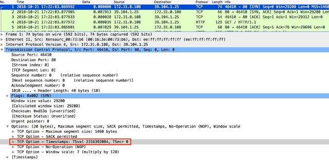 因为tcp_tw_recycle是一个系统参数,而timestamp是TCP option里携带的一个字段,我们主要需要关注下timestamp的变化。如果你足够熟悉SLB,可能并不需要抓包就知道SLB对TCP timestamp做了什么。但是我们这里按照正常的排查方法:抓包,比较在引入SLB之前和之后报文有什么区别。