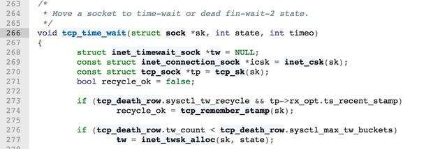 Linux kernel不同版本的代码可能会有小的,这里根据的是3.10.0版本的代码。TCP进入TIME_WAIT(FIN_WAIT_2)状态的逻辑在tcp_minisocks.c中的tcp_time_wait()中。