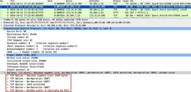 而在客户端观察SLB的回包时,可以看到TCP Option中的TCP tiemstamps已经不存在了,而客户端在直接访问后端服务器时TCP tiemstamps是一直存在。通过对比,发现这就是引入SLB后带来的变化:SLB抹去了TCP Option中的timestamps字段。